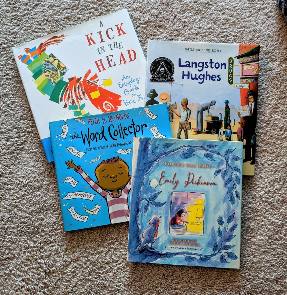 April 2, poetry for children. I’m sharing four books that I love and that I’ve used when teaching creative writing to little ones. Classic poets like Emily Dickinson and Langston Hughes are worthwhile for children especially in these beautifully illustrated editions. And The Word Collector by Peter Reynolds is inspiring for kids to start finding words they like (and works well with magnet poetry lessons). And finally A Kick in the Head: An Everyday Guide to Poetic Forms by Paul B. Janeczko is great for reading aloud and introducing structure to more serious little writers. I love each of these books and am sharing my favorite pages from them too!