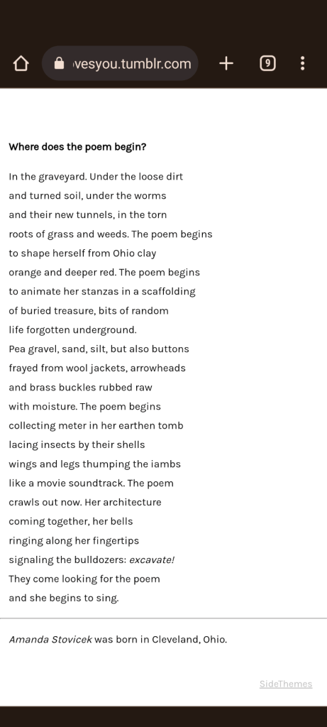 April 21, published poem. Sharing a poem from pre-pandemic from a poetry month feature called Ohio Loves You (presented by the now sadly defunct Barnhouse Journal). What I love about this poem is the ars poetica feel and the playful nature.